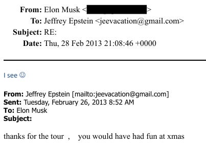 Feb 26: Epstein thanks Musk for the tour, “you would have had fun at xmas”. Musk: “I see :)” [EFTA00955694]