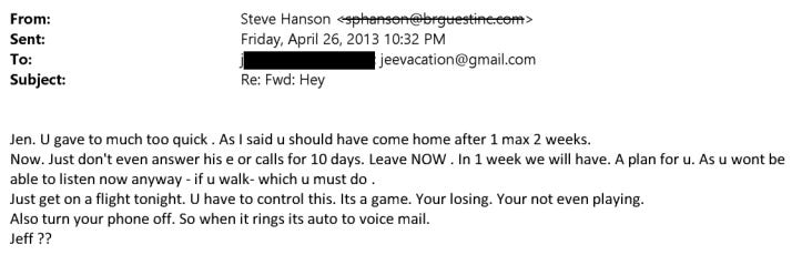She also forwarded the email to Steve Hanson (NYC restaurant mogul, founder of BR Guest), who scolded her for giving Kimbal too much too fast. “Leave NOW. In 1 week we will have. A plan for u,” Hanson wrote. “U have to control this. It’s a game. Your losing. You’re not even playing. Also turn your phone off.”