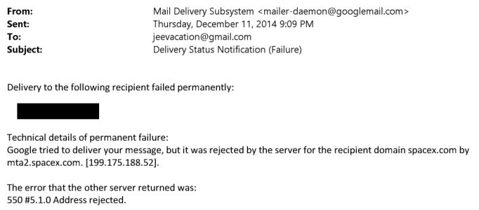 Epstein’s email bounces, “550 #5.1.0 Address rejected.” This suggests rejection at SpaceX server level, likely that Musk blocked his address. [EFTA02356626]