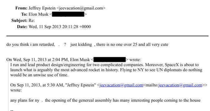 Sep 11: Epstein invites Musk to New York, says the UN general assembly gathering will bring “many interesting people” to the house. Musk says he has no time to see UN diplomats, to which Epstein retorts: “do you think i am retarded, . ? just kidding , there is no one over 25 and all very cute”. [EFTA00970520]