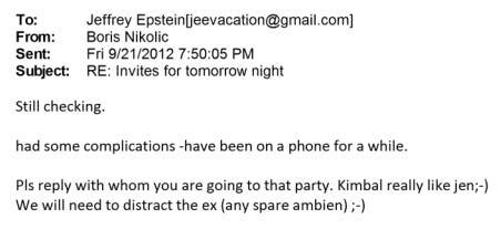 “So please prepare Jen —;)” Nikolic told Epstein on September 18. “She might like Elon as well.” On the 21st, Nikolic brought up Ambien to keep Kimbal’s ex out of the way. “We will need to distract the ex (any spare ambien);-)”, he wrote.